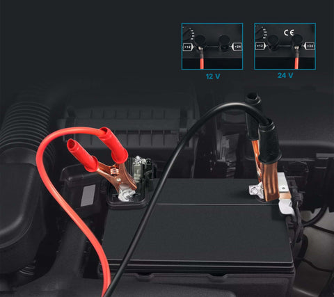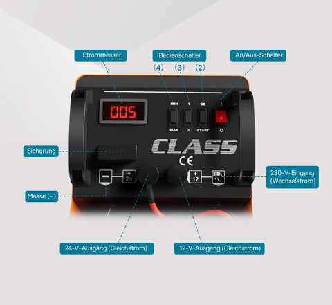 The start-up system is mobile and, being equipped with oversized wheels, also suitable for bumpy ground. The high-quality pole clamps with insulated handles grip strongly and never fall off the battery poles.