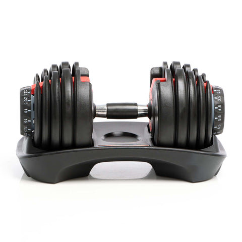 Are you looking for workout equipment and already have considered buying several dumbbells and different weight plates? You can now revise your plan: just purchase this short dumbbell whose weight is variably adjustable and with which you can do a lot of different exercises. This is done thanks to the built-in rotary mechanism that allows adjusting the dumbbell to a weight going from 2.5 to 24 kg. For this purpose, the short dumbbell is placed onto the base, where the weight that you wish to workout with is adjusted. Set the same value on either side of the dumbbell to make the mechanism work. Now, the dumbbell lays down or takes up weight plates to reach the weight adjusted. This might sound somewhat complex; yet, the users only have to activate the rotary mechanism. There they will see the individual weight steps; these are selected with a few movements only.