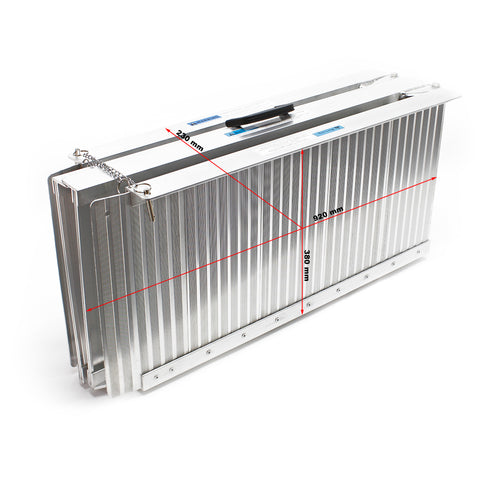 This practical, double foldable wheelchair ramp made from a light aluminium can be easily transported and is the perfect mobile help. It is foldable both in length and width. Stair steps are bridged without any effort and provide for a barrier-free access.